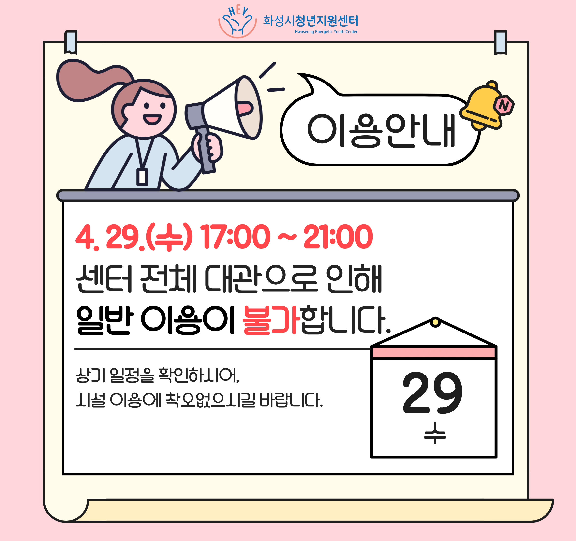 안녕하세요, 화성시청년지원센터입니다. 4. 29.(수) 17:00 ~21:00 센터 전체 대관으로 인해 일반 이용이 어렵습니다. 상기 ....