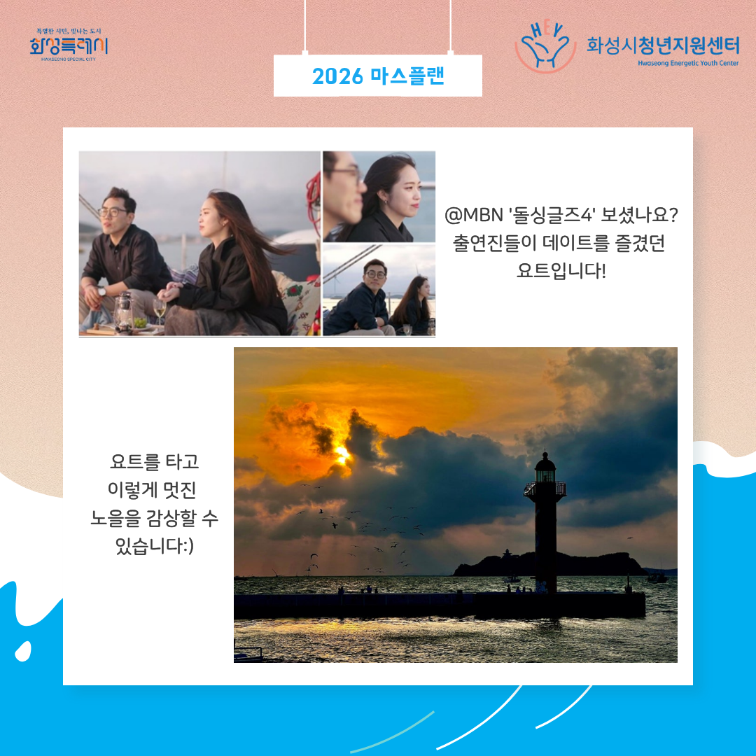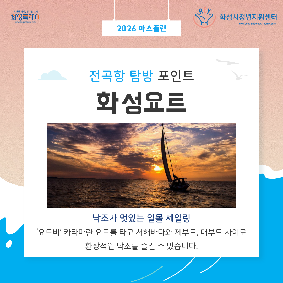 그 첫 번째 여정은 낭만 가득한 '전곡항 탐방' 입니다. 화성시의 보석 같은 명소들을 함께 둘러보며 소중한 추억을 만들어보세요:)