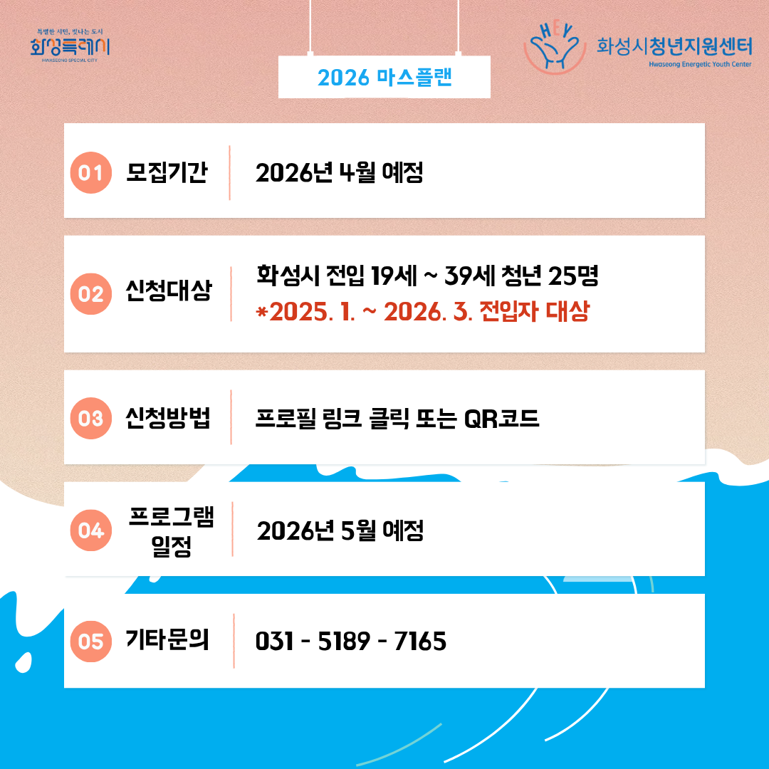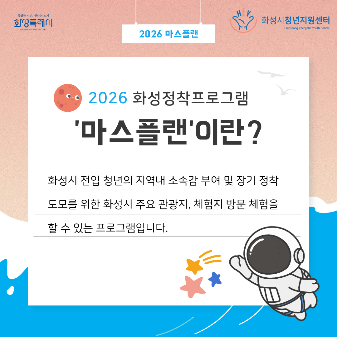 화성시에 첫발을 내딘 청년 여러분의 안정적인 정착을 응원하며, 2026년 화성정착프로그램 <마스플랜>을 시작합니다!