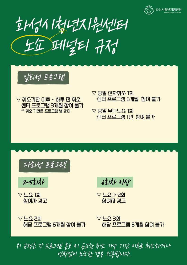 [화성시청년지원센터 노쇼 페널티 규정]을 안내합니다.
