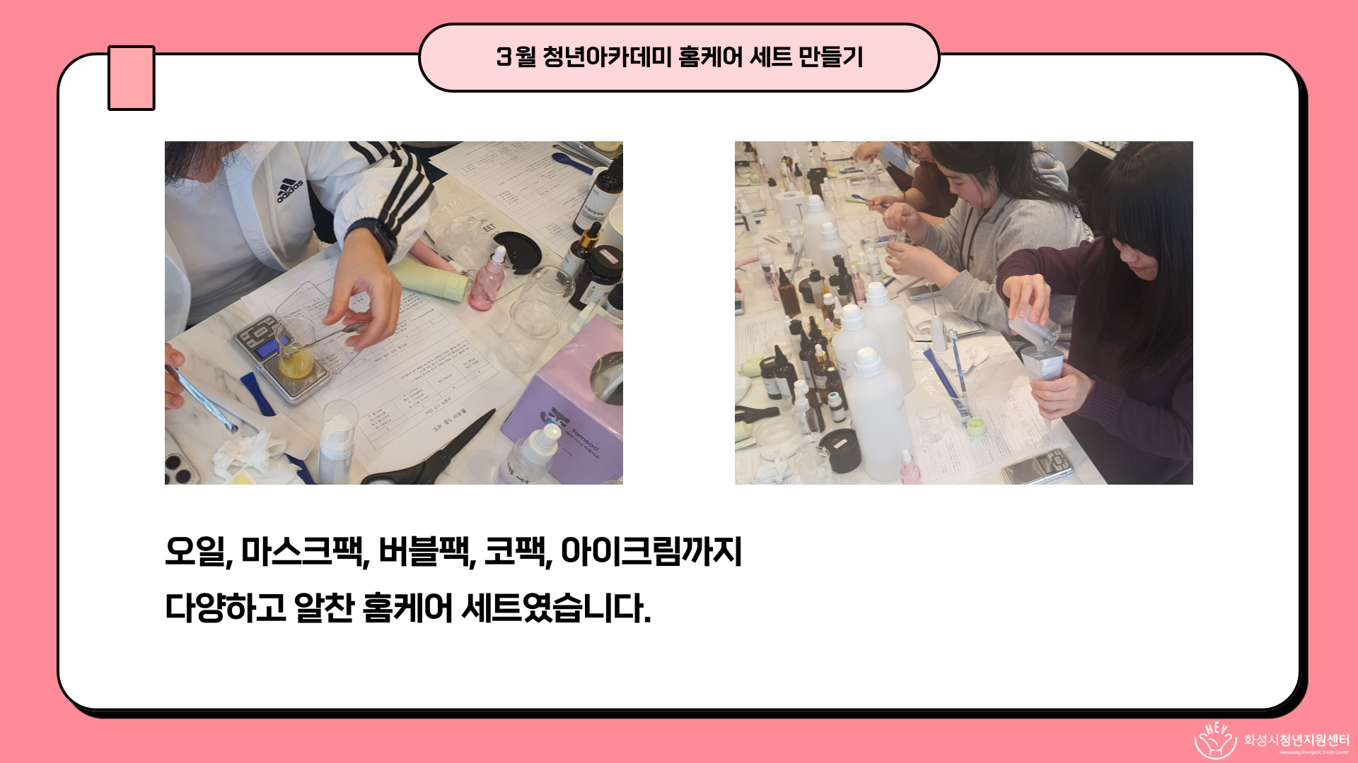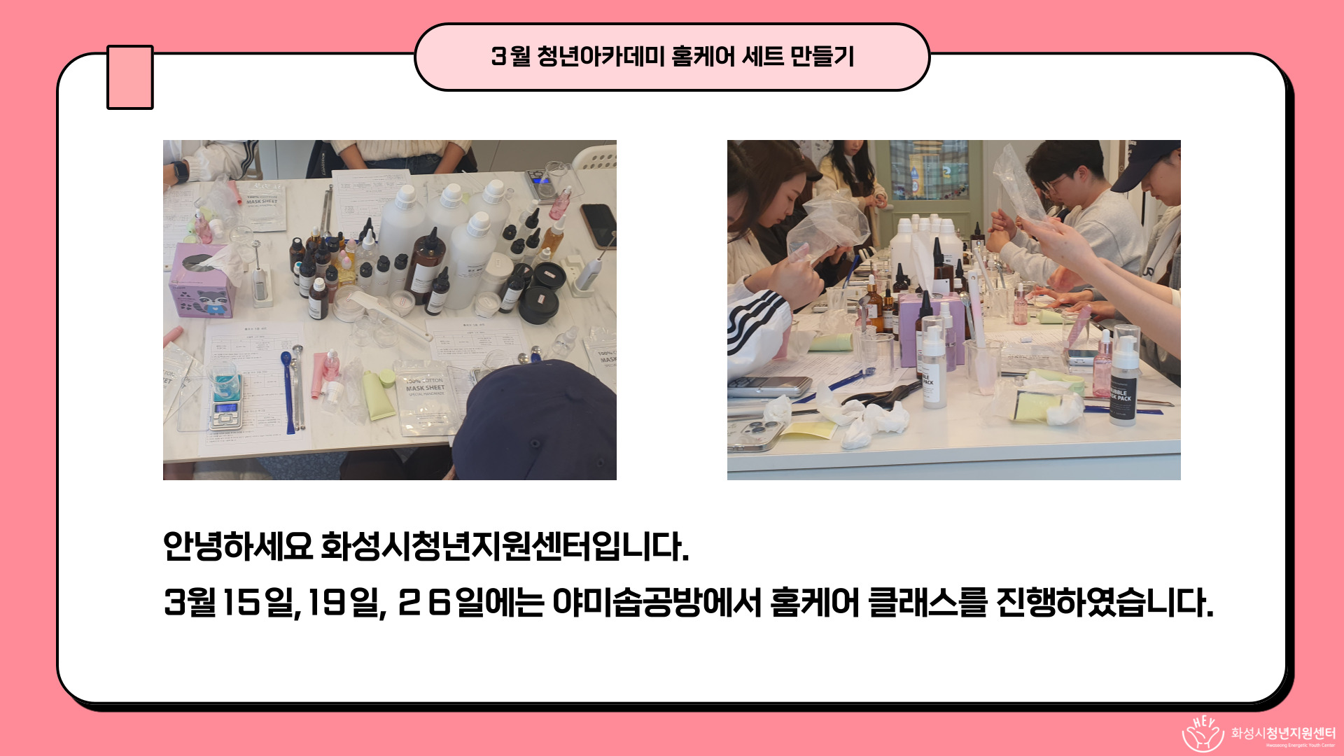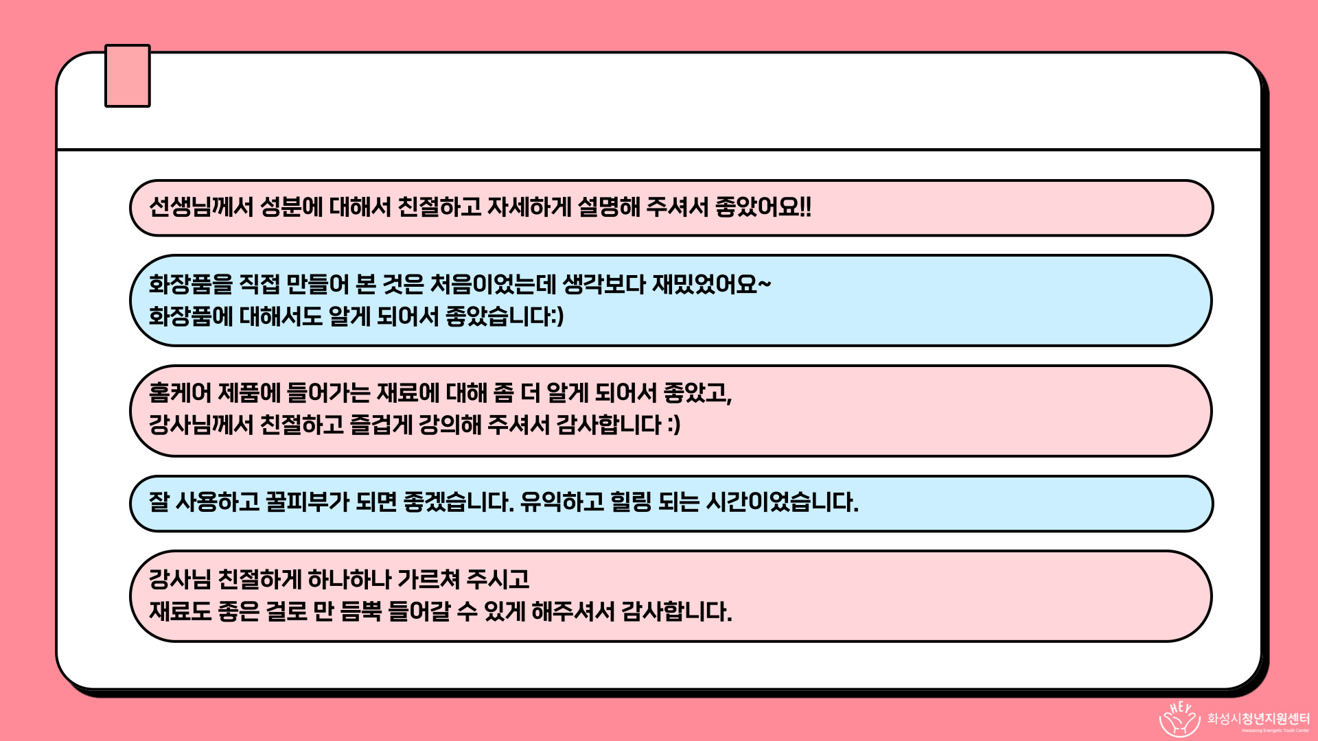 HOME > 프로그램 > 프로그램 리뷰 프로그램 리뷰 화성시청년지원센터 Hey 활동 리뷰 화성시청년지원센터는 개인정보보호법 및 정보통신망 이용촉진 및 정보보호 등에 관한 법률을 준수하며, 강사님들의 개인정보 수집 및 활용에 대해 동의를 얻었음을 명시합니다.