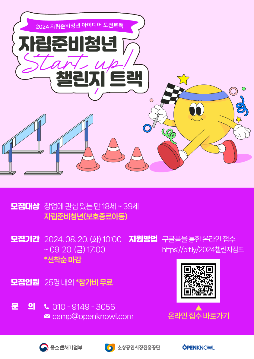 □ 지원내용 : 챌린지캠프(2박3일) 및 온라인 역량강화교육, 맞춤형 1:1 멘토링 및 실험창업준비금 최대 300만원(100% 정부보조) 등