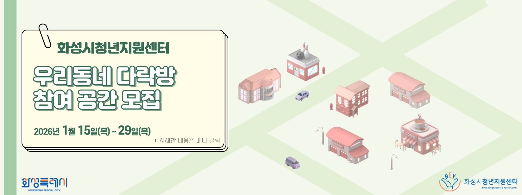 안녕하세요. 화성시청년지원센터입니다 화성시에서는 민간에서 운영하는 다양한 공간을 청년활동공간으로 역할을 부여하여 청년들에게 건전한 모임을 제공하고자 ....