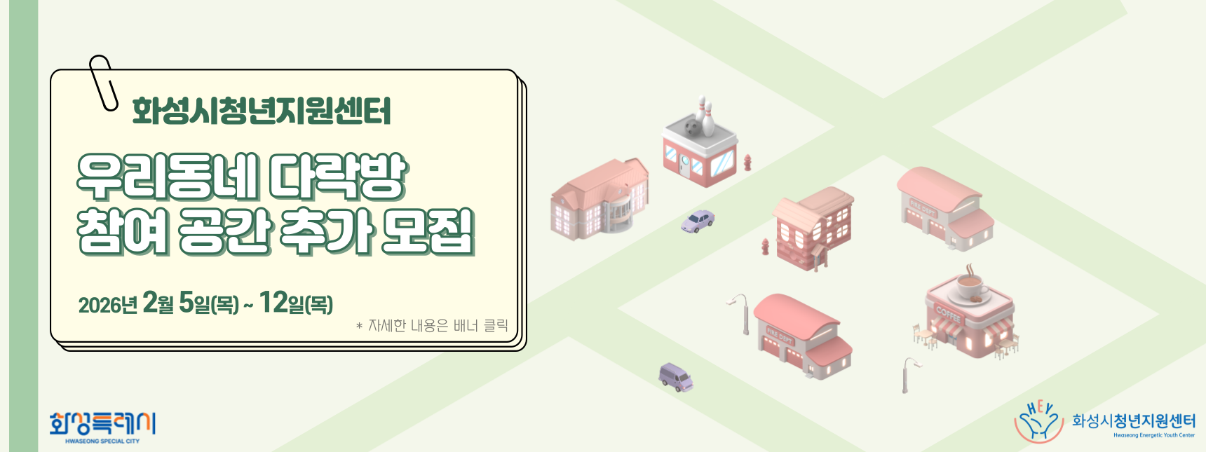 안녕하세요. 화성시청년지원센터입니다 화성시에서는 민간에서 운영하는 다양한 공간을 청년활동공간으로 역할을 부여하여 청년들에게 건전한 모임을 제공하고자 2026년 『생활밀착형 청....