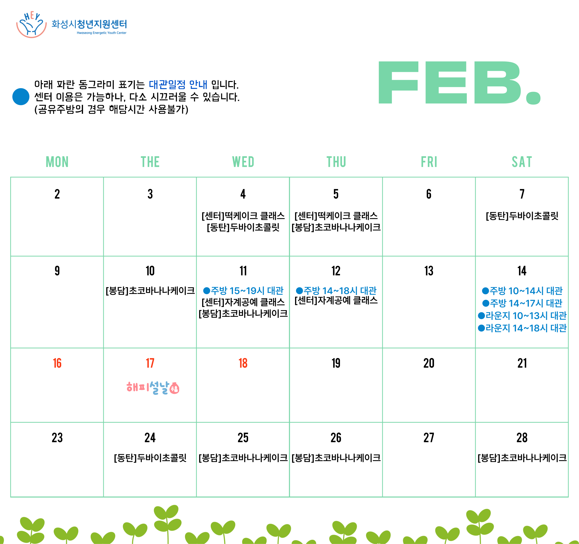 안녕하세요! 화성시청년지원센터 2월 HEY 프로그램 및 대관 일정 공유드립니다. 위에 안내된 날짜와 시간에도 세미나실, 센터공간 이용은 가능하나....