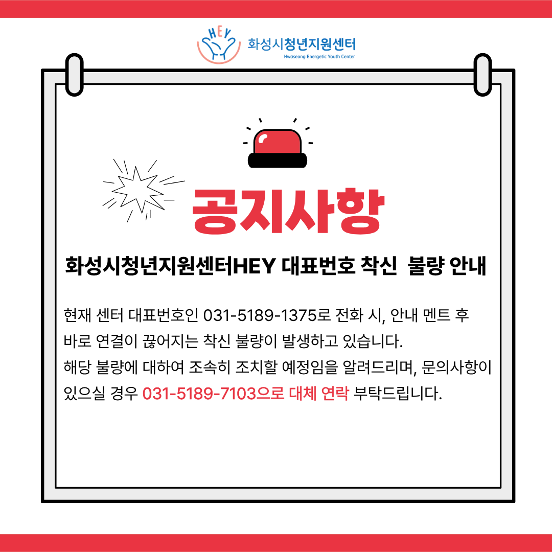 화성시청년지원센터HEY 대표번호 착신 불량 안내